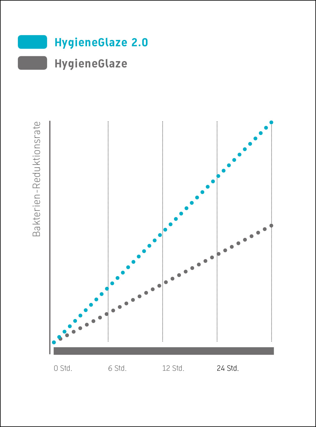 Allerede efter seks timer er 90% og efter 24 timer 99,999 % af bakterierne (f.eks. coli) dræbt - et hidtil uset niveau. Desuden hæmmer HygieneGlaze 2.0 væksten af bakterier (f.eks. E. coli) sammenlignet med normalt glasur.